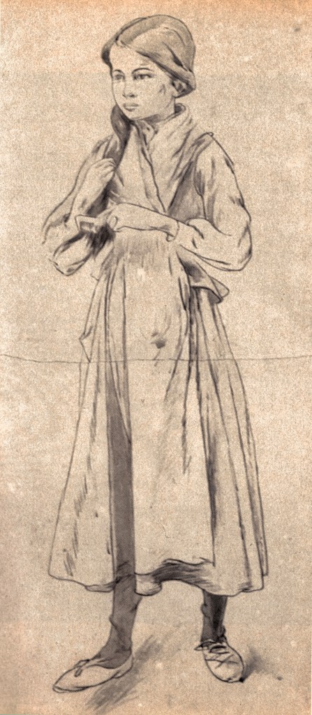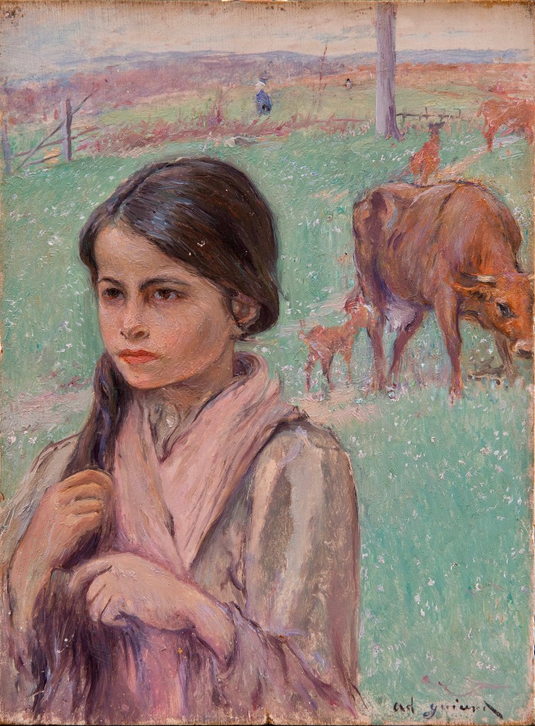 Por desconocerla entonces, no pude incluir esta pieza en la exposición antológica de la obra de Guiard que comisarié para el Museo de Bellas Artes de Bilbao en 1983 y, en consecuencia, tampoco aparece reproducida en el libro que acompañó a aquella muestra. Sin embargo, en esta publicación sí se daba a conocer un dibujo (61 x 27 cm, bastante más grande que la pintura) conservado por los descendientes del artista que reproduce la figura de esta misma niña a cuerpo completo, lo cual supone una importante diferencia con respecto al óleo, pues en éste sólo aparece, poco más o menos, de cintura para arriba. Se puede suponer con cierto fundamento -ya que en otras pinturas Guiard actuó así, elaborando aproximaciones parciales a un tema más amplio- que llegó a realizar una pintura de mayores dimensiones en la que esta aldeanita se muestra tal como aparece en el dibujo.