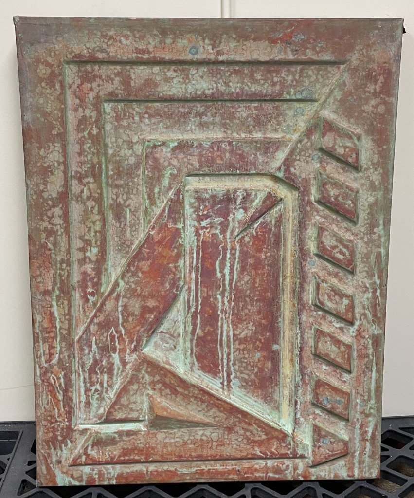 Placa de bronce, vendida y recuperada, como las que decoran la fachada de la Price Tower, Frank Lloyd Wright