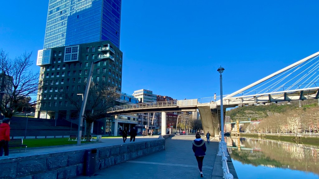 Pasarela de Santiago Calatrava, a la derecha, a uno de cuyos extremos (este que se muestra) se hizo llegar otra pasarela sobre pilares cilíndricos con motivo de la construcción de las torres de Izosaki.