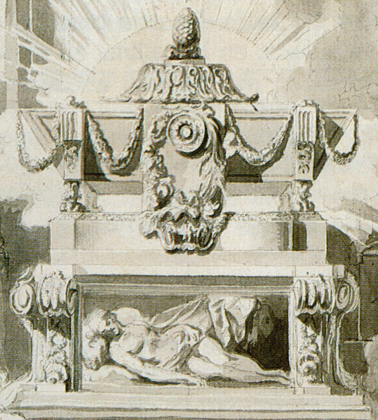 Como se puede apreciar en el detalle arriba ampliado, obviando la escenografía envolvente, la construcción funeraria constaba de dos partes: la inferior era un altar en cuyo frente de encontraba la pintura de Cristo muerto y la superior consistía en un sepulcro alzado sobre garras de león, engalanado con guirnaldas florales y un medallón central del que colgaba -al parecer- un vellocino (símbolo de autoridad y realeza en la mitología griega). Se cerraba con una losa plana sobre la que en adornada basa se alzaba una piña (como precinto del sepulcro y como fruto asociado a la fertilidad por sus muchas semillas, símbolo de eternidad por su forma triangular ascendente). El sepulcro, arriba, transmitía la idea de muerte del hijo de Dios como acontecimiento glorioso, pero el cuerpo se hacía visible, abajo, como el de un hombre corriente. En realidad, el conjunto muestra dos tipos diferentes de enterramiento: en sepulcro y en nicho. El ataúd en lo alto venía a decir «aquí dentro está Cristo», mientras la pintura cerca del suelo, como si a un nicho se le hubiese retirado la tapa lateral, completaba la frase «pero aquí lo puedes ver».