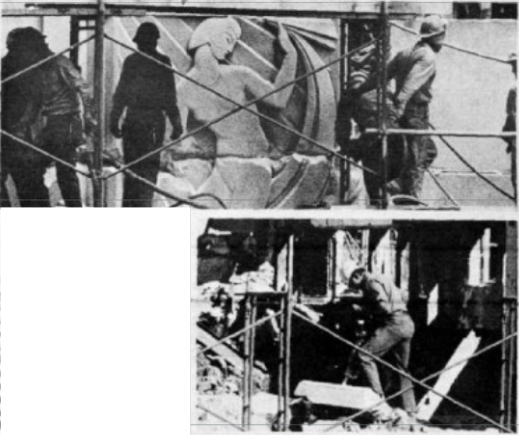 Obreros de la construcción a las órdenes de Trump destruyen con martillos neumáticos los relieves.En el equipo de demolición de Trump había trabajadores polacos indocumentados para mantener bajos los costes del derribo, lo que llevó a Trump a un litigio. El contratista para demoler el edificio Bonwit Teller, fue William Kaszycki, de Kaszycki & Sons Contractors, quien finalmente cumplió condena en prisión por emplear inmigrantes ilegales en otro proyecto. Después de una batalla legal que duró muchos años, un juez federal determinó que Trump y sus socios habían conspirado para evitar pagar cuotas al sindicato Homewreckers Local 95.