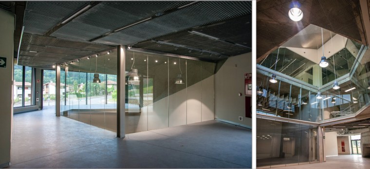 No obstante, a su interior penetra bastante claridad por puertas y ventanas distribuidas entre esquinas, recodos y chaflanes. El espacio se articula en torno a un patio, cubierto y cerrado con planchas de cristal de suelo a techo, que atraviesa verticalmente todas las plantas, haciendo visible la actividad en cada nivel. Estos muros acristalados en torno al patio permiten que la luz exterior se expanda ampliamente por el interior. Las barandas en escaleras son rejillas metálicas de acero galvanizado que no crean sombras y dejan paso a la luz. En las plantas inferiores las instalaciones para ventilación, electricidad, agua y otras necesidades quedan al descubierto. En la planta baja algún espacio dispone de doble altura. Los materiales dominantes son hormigón, cristal y metal.