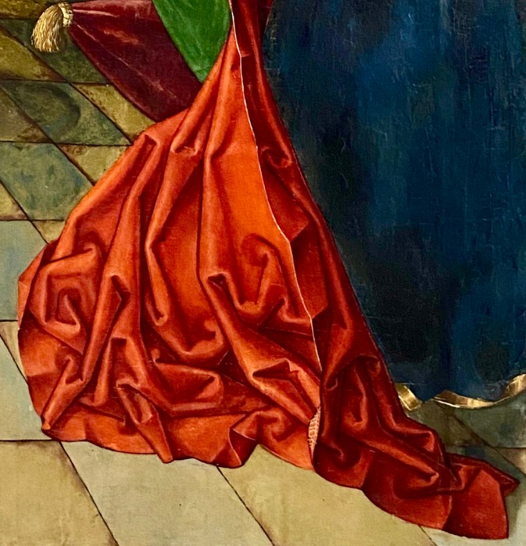 Como no tengo información adicional ni planos ni memorias de proyecto ni nada, me las tengo que componer con un acercamiento personal y sui-generis al edificio y, en particular, a su cubierta confeccionada con planchas de acero corten oxidado que actúa como segunda piel. Dadas las fuertes raíces medievales de las Encartaciones y que su entorno industrial ha tenido una actividad importante durante más de un siglo en la fabricación de pasta de papel (Papelera del Cadagua, en Güeñes y Zalla), lo fácil sería mencionar el origami y la papiroflexia como inspiración para explicar esa quebrada y ondulante forma. Sin embargo, me he puesto fantasioso y ya que la fabricación de muebles (numerosas empresas en Balmaseda y Zalla) y tejidos (Boinas La Encartada, en Balmaseda) ha sido igualmente destacada -sin olvidar el Concurso Internacional de Vestidos de Papel, de Güeñes, reuniendo papelería y vestimenta durante más de 50 años- he querido pensar que la idea procede de los pliegues en las partes bajas de indumentarias vestidas por personajes en las pinturas sobre tablas del gótico tardío. Aquí van unos cuantos ejemplos vistos en obras conservadas, en su mayor parte, en la Catedral de Burgos.